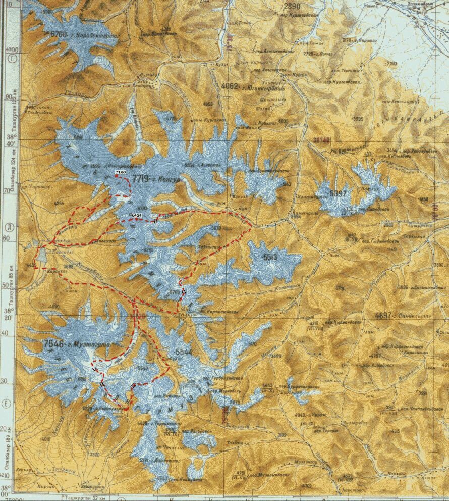 Бонингтона (5465,2Б) - рад. выход через пик 70- летия МАИ (6982) на вост.