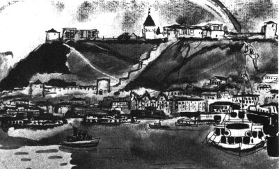 У Казани пароход стоял долго, можно было посмотреть город, но зыбучие пески нас туда не пустили. Пристань была далеко от города. Зато Кама с нестеровскими берегами и голубой очень сильной водой была обворожительна. Она уже Волги и уже Оки, берега с обеих сторон высокие, лесистые, затем пониже.