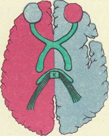 Рассечение связей между двумя полушариями 19, 21-- 23