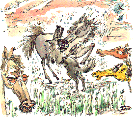 Конь (разглядывая Малыша). Какой у меня вырос красивый сын! (Валится на другую сторону.)