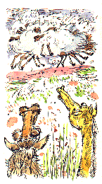 Малыш вновь останавливается, смотрит то на Коня, то на Ветку, то на Мать. Мать начинает громко и тревожно ржать.