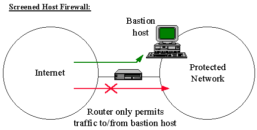 Example Network level firewall: In this example, a network level firewall called a "screened host firewall" is represented. In a screened host firewall, access to and from a single host is controlled by means of a router operating at a network level. The single host is a bastion host; a highly-defended and secured strong-point that (hopefully) can resist attack.