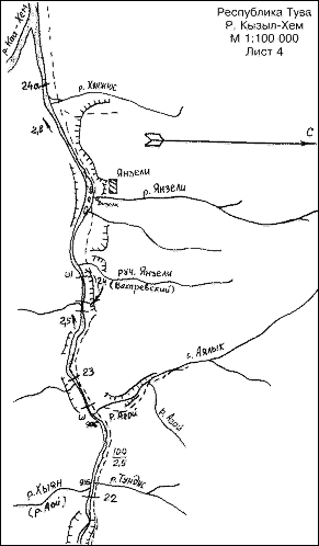 17-19. Валы в пределах 1-1,2 м. После пор. 17 слева впадает крупный приток р. Кара-Хем (Кара-Бельдыр) в живописном каньоне.