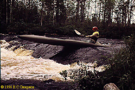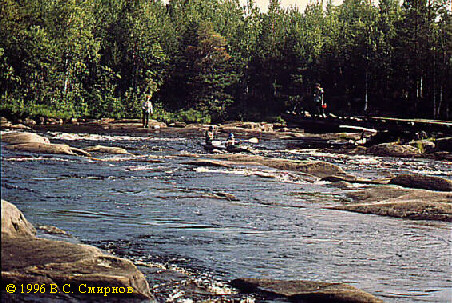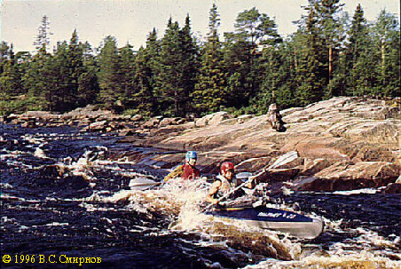 Порог No47 (IIб, 350 м). Первая часть -- шивера длиной около 100 м. Сходу. Дальше лучше осмотреть по левому берегу. Слив в середине порога и довольно мощная шивера (250 м). Сразу --